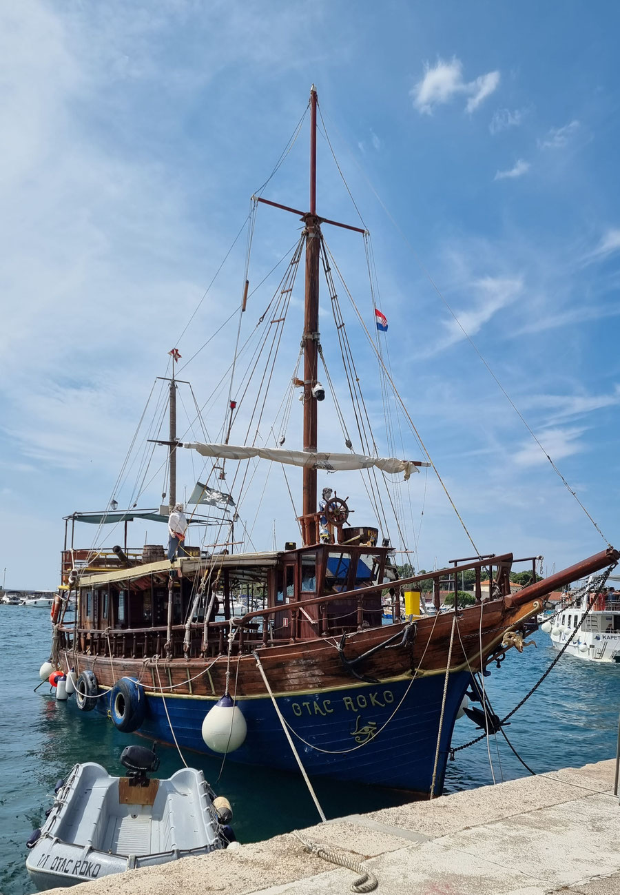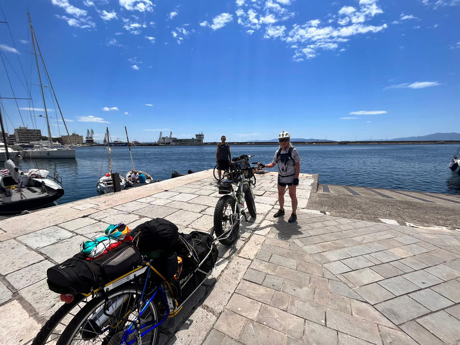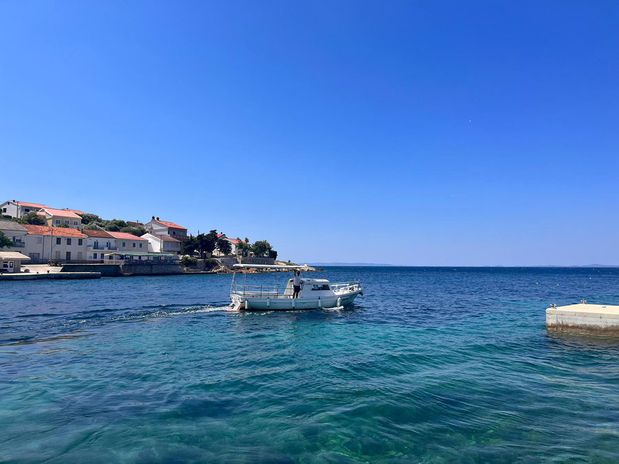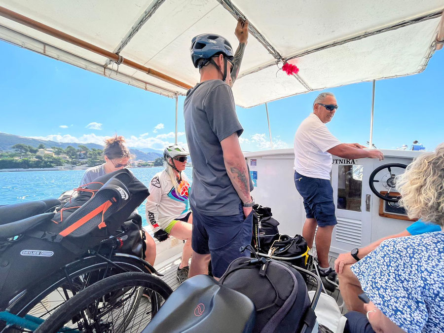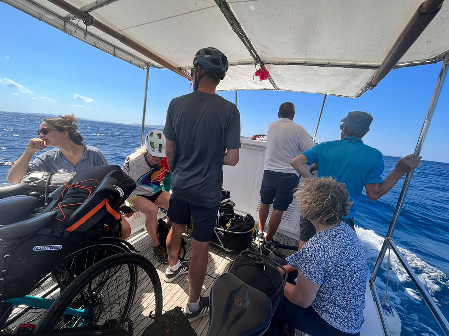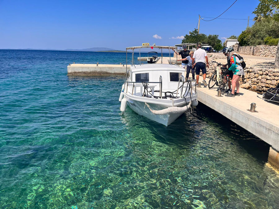 Fahrt nach Rab zur Fähre nach Lun (Insel PAG) und weiter mit Fährentaxi (Mario) für 10€ pro Person mit 6 Fahrräder, Anhänger und 6 Personen auf 10meter Kutter, ein unvergessliches Erlebnis. Weiterfahrt nach Novalja auf Campingplatz Strasko